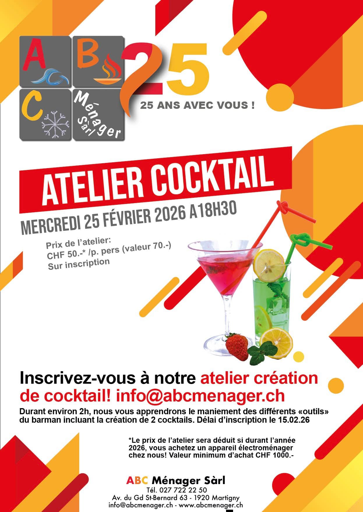 Dans le cadre de nos 25 ans, nous organisons des ateliers. En février c'est "Atelier cocktail". Durant environ 2h, nous vous apprendrons le maniement des différents "outils" du barman. Nous réaliserons 2 cocktails (sans et avec alcool).